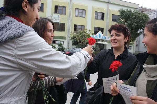 TÜM-İGD'li Kadınların da aralarında bulunduğu Mersin Kadın Platformu, "8 Mart Dünya Emekçi Kadınlar Günü" dolayısıyla Mersin Serbest Bölge'de kadın işçilere karanfil dağıtımı yaptı.