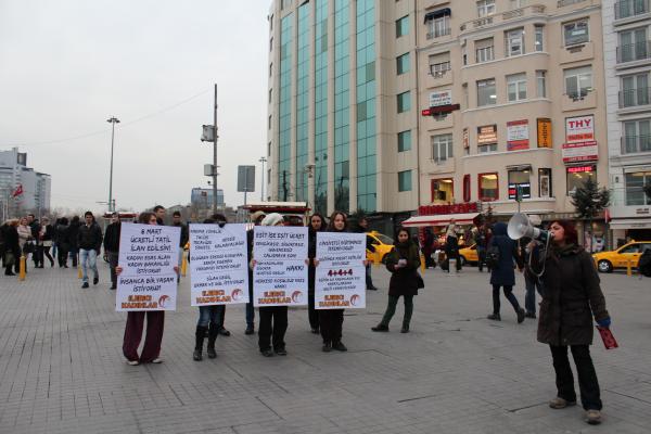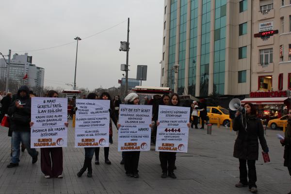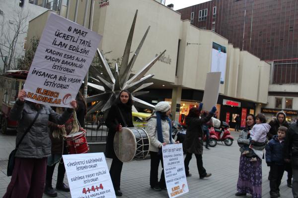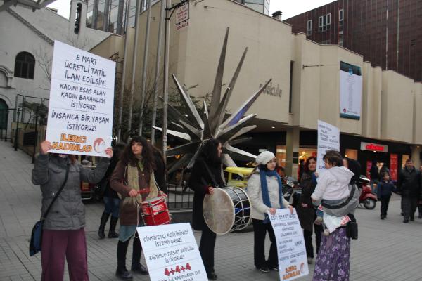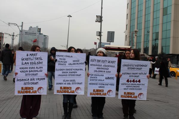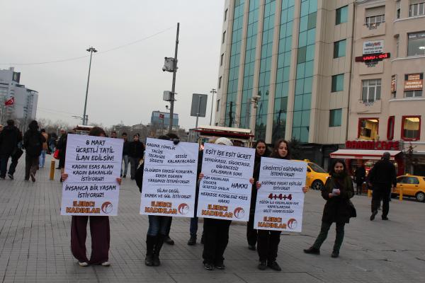İlerici Kadınlar 8 Mart Dünya Emekçi Kadınlar Günü'nde dün (08.03.2012) saat 15.00'da Taksim Meydan-Taksim Tünel hattında davulları, trompetleri, pankartları, bildirileri ile 11 Mart 2012 Pazar günü Kadıköy'de yapılacak olan mitinge çağrı yaptı. İlerici Kadınların gerçekleştirdikleri eylem İstanbullu kadınların yoğun ilgisiyle karşılaştı.