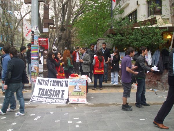 Bugün (21.04.2012)saat 12.00'da Yüksel Caddesi'nde açılan "Haydi 1 Mayıs'a Taksim'e"standıyla İlerici Gençler Ankara halkını, işçi sınıfın dayanışma ve mücadele gününde Taksim'de birlik olmaya çağırdı.