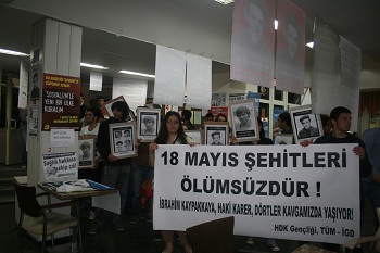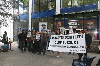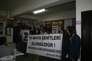 Bugün (17.05.2012) Ankara Üniversitesi Cebeci Kampüsü'nde 18 Mayıs şehitleri anıldı. HDK Gençliği ve TÜM-İGD'nin örgütleyicisi olduğu anmada fakülteler dolaşılarak öğrenciler kampüs önündeki basın açıklamasına çağrıldı.