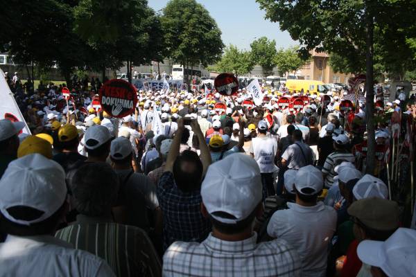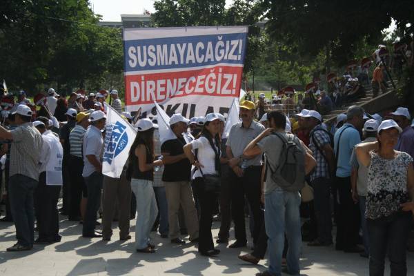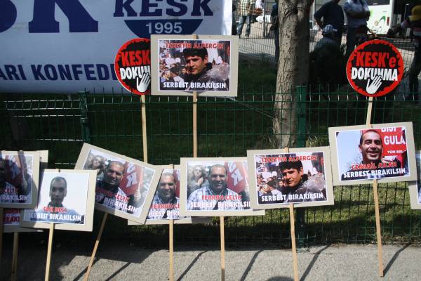 Kürdistan Topluluklar Birliği (KCK) üyesi olmak, birçok yasal miting ve eyleme katılmak gibi farklı suçlar(!) ile suçlanarak 25 Haziran günü gözaltına alınan Kamu Emekçileri Sendikaları Konfederasyonu (KESK) üyesi 58 sendikacıdan 35'i bugün (27.06.12) Ankara Adliyesine getirildi. Yüzlerce kamu emekçisi ve aralarında TKP 1920'nin de olduğu çok sayıda ilerici, devrimci yurtsever kurum da KESK'li tutsaklara özgürlük talebini yükseltmek için adliye önünde yerini aldı. KESK'lilerin duruşması yarın da devam edecek.