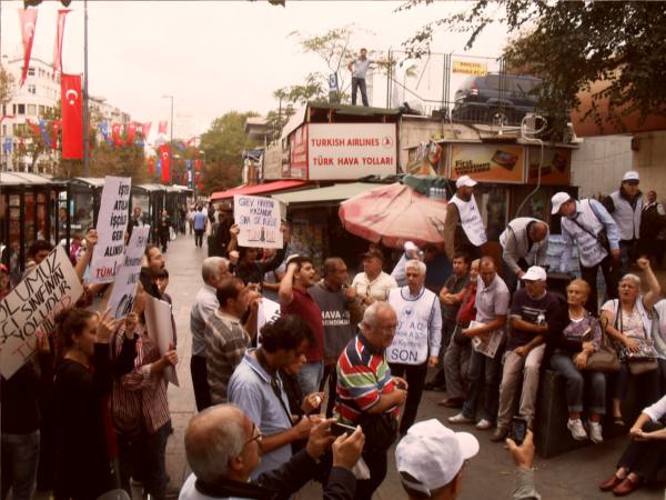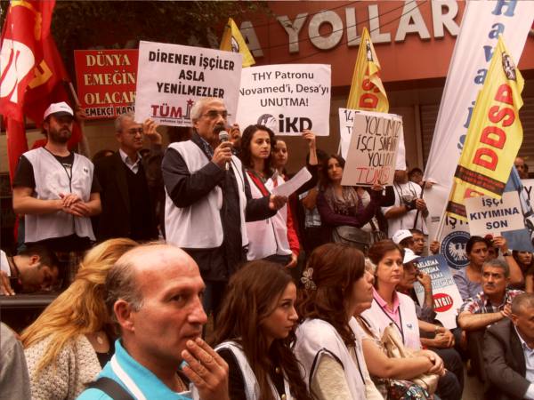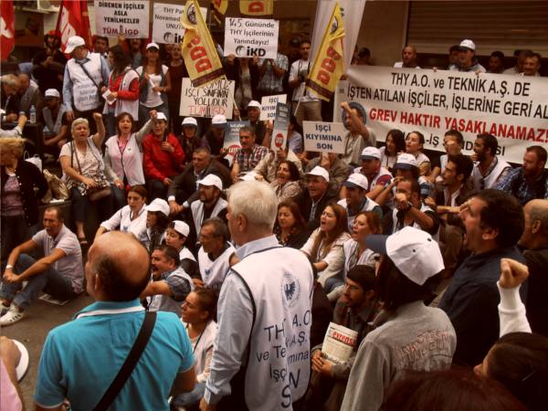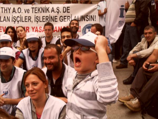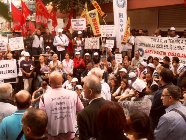 144 gündür grev yasağına ve işten atmalara karşı direniş gerçekleştiren THY işçileri, bugün (20.10.2012) saat 14.00'da Taksim'de THY Satış Bürosu önünde oturma eylemi gerçekleştirdi. Grev yasağını mücadeleyle ortadan kaldıran hava yolu emekçileri "Yasağı aştık sıra, işe geri dönüşte" sloganını gür sesle haykırdı. Direnişin ilk gününden beri bulunduğu her alanda hava yolu emekçilerine destek olan TÜM-İGD'li gençler de eylemde yerini aldı.